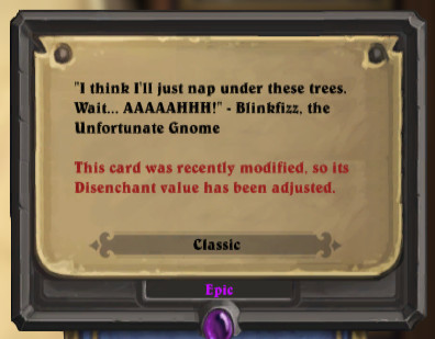 This adjustment is put into effect through increasing the normal disenchanting value for the changed cards. Because of this, the extra Dust is provided whether the card was crafted before the card was changed, or afterwards.[2] As a result, players are able to craft and later disenchant these cards (within that period) without penalty, allowing them to try the cards in their decks before deciding whether to keep or disenchant them. However, since almost all eligible card changes are nerfs, this is generally less desirable than might be expected.