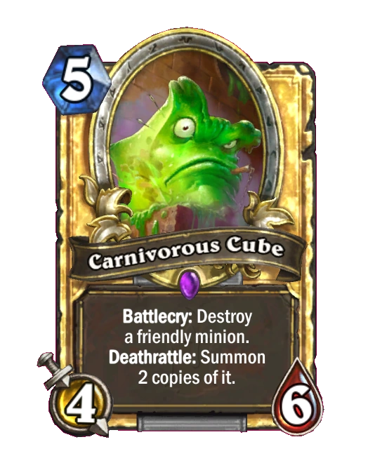 - The two minions summoned by the Carnivorous Cube's Deathrattle will be in their base state, undamaged and with no enchantments, regardless of the state of the original minion at the time it was destroyed by the Cube.