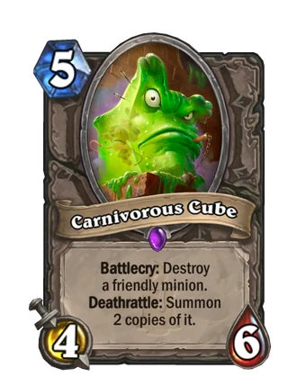 - If a Carnivorous Cube swallows another Carnivorous Cube (triggering its Deathrattle as usual for destroy effects), it will summon two "empty" Carnivorous Cubes upon death, meaning that the Deathrattles of the two summoned Cubes will have no effect and will not summon any additional minions.