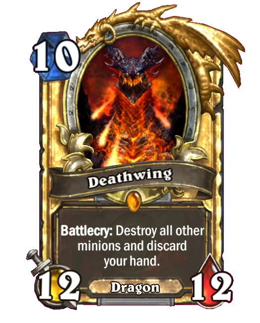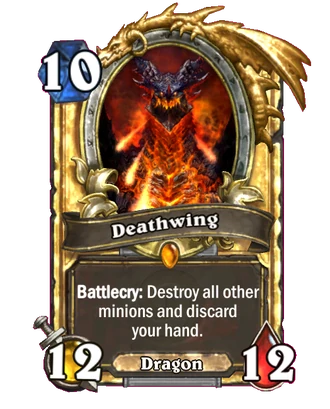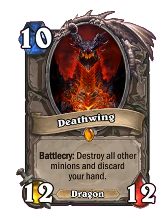 Deathwing is a very risky but potentially very rewarding card. It has high stats for its cost, and its Battlecry can be devastating to both you and your opponent. This minion is meant to end games, one way or another. You could destroy all your opponent's minions and win on the following turn; or you could discard your entire hand and be left with only a single minion on the battlefield that the opponent can easily remove on their turn with a destroy or transform effect.