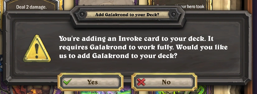 - Adding an Invoke card to your deck without Galakrond while building a Priest, Rogue, Shaman, Warlock, or Warrior deck will display a special text box prompting you if you want to add Galakrond to your deck.