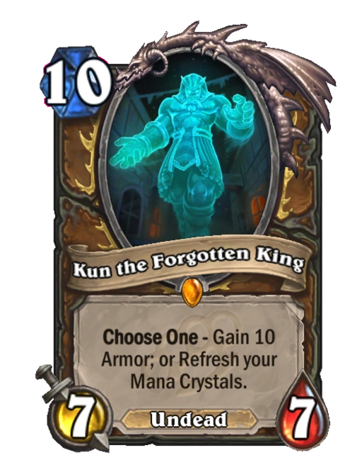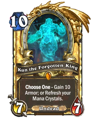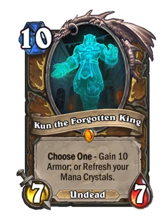 Kun the Forgotten King is a legendary druid minion card, from the Mean Streets of Gadgetzan set.