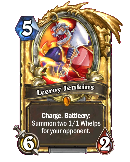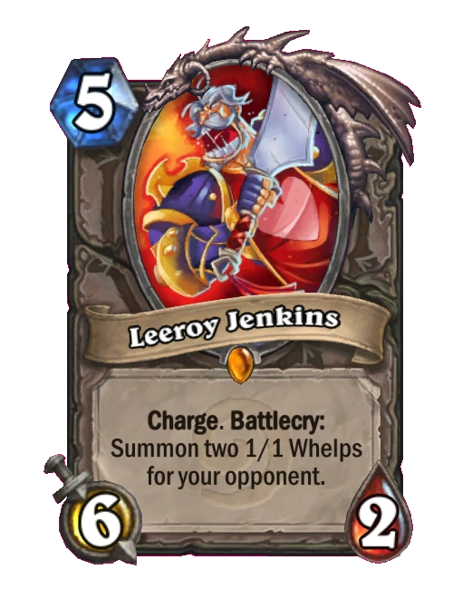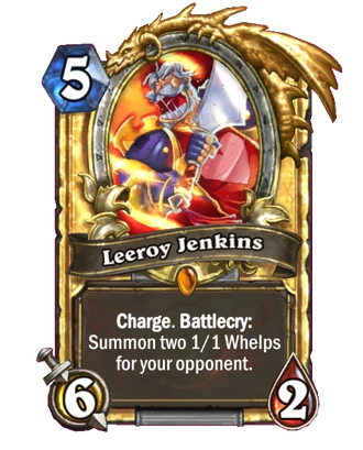 - Commentary: "Leeroy Jenkins created a strategy that revolved around trying to defeat your opponent in one turn without requiring any cards on the board. We like having a variety of deck types but taking 20+ damage in one turn is not very fun or interactive."