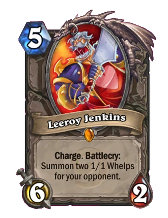 CHARGE BATTLECRYRARITY=5 CLASS=12 COLLECTIBLE=1 ELITE=1 COST=5 HEALTH=2 ATK=6 CARDTYPE=4 FACTION=2 251=6 ENCHANTMENT_BIRTH_VISUAL=0 ENCHANTMENT_IDLE_VISUAL=0 CHARGE=1 BATTLECRY=1Leeroy Jenkins is a legendary neutral minion card, inducted into the Legacy set, formerly from the Classic and Hall of Fame sets.