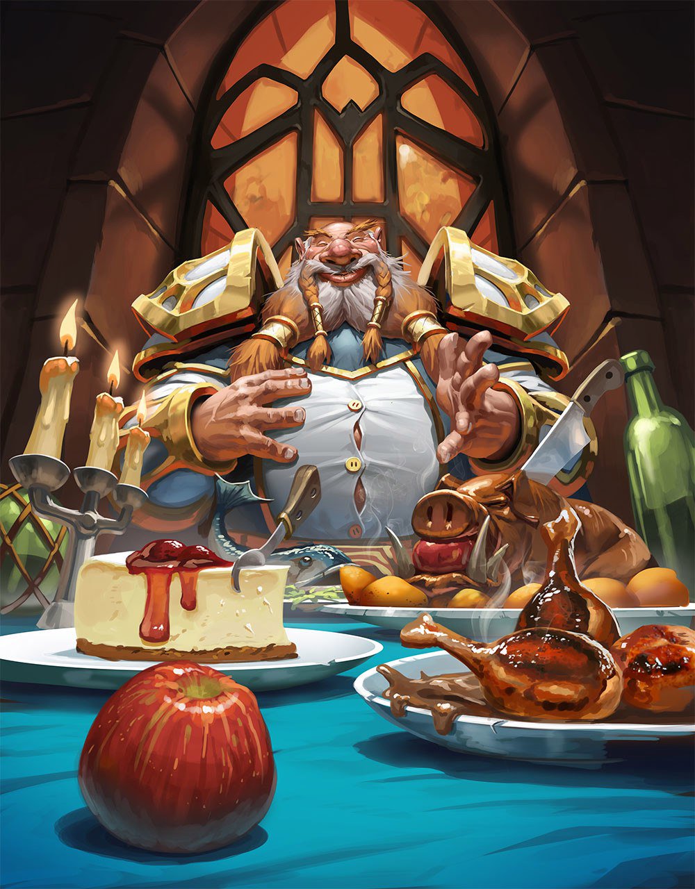 Priest of the Feast is a dwarven priest with a penchant for eating banquets, especially funnel cakes. The character canonically has a son, the Scholomance Academy student depicted in the artwork of ![]()