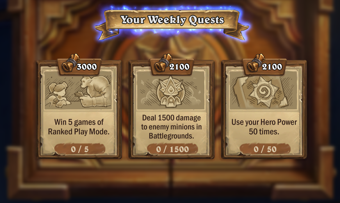 | Win 5 games of Tavern Brawl, Battlegrounds, or Duels. | 1750 XP |