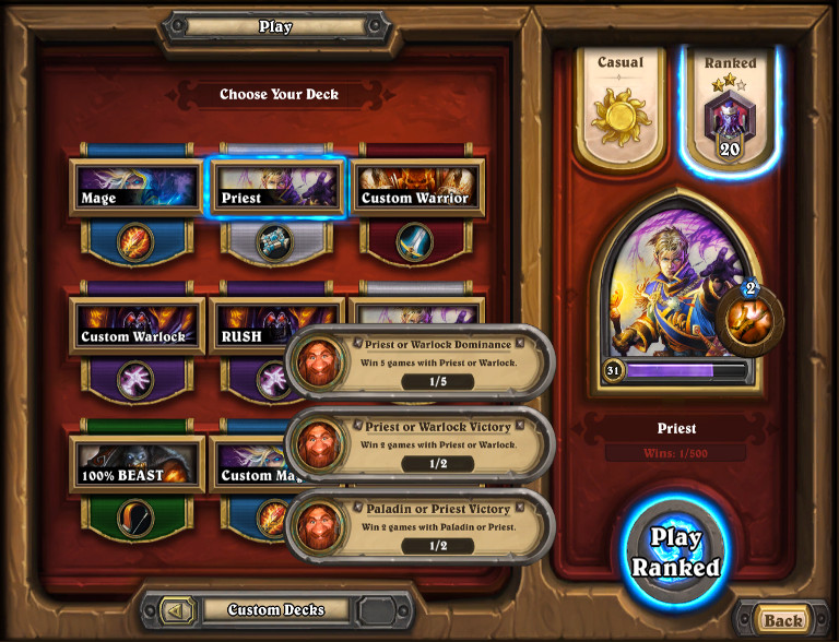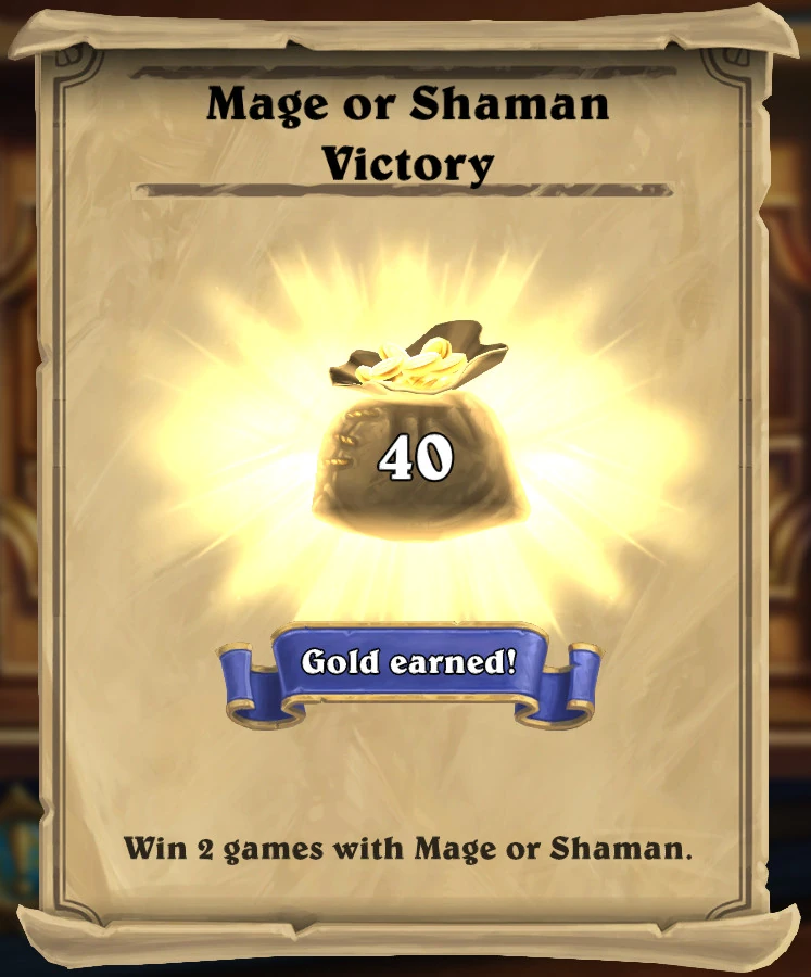 Skill with specific classes can significantly affect gold per game played. Achieving a few wins using a class with which the player is relatively accomplished may be an easily and swiftly completed task, while the same objective using a class which they have never played, and for which they have few good cards, may take a very long time to achieve. It should also be noted that matchmaking does not take into account the player's familiarity with their chosen deck; if a player who is highly ranked with mage takes up rogue for the first time in order to complete a related quest, their opponents will still match the player's usual level of performance, which may make it difficult for them to achieve a win with their beginner's rogue deck. This provides another reason to re-roll class quests in exchange for more suitable substitutes.