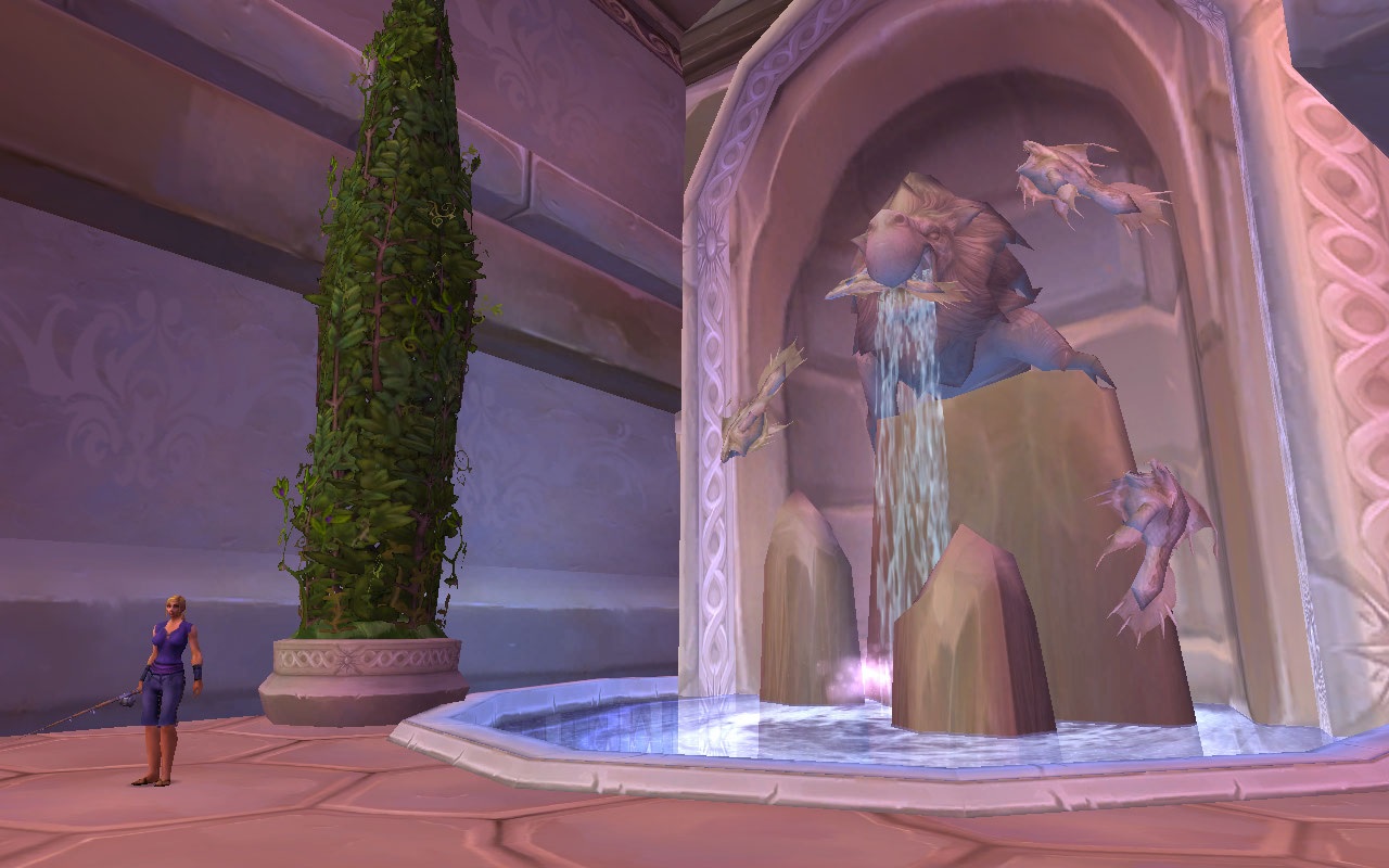 Walking Fountain is ostensibly connected to the famous Dalaran fountain, a wishing well located in the city's Eventide district. Notably, players can fish from the fountain in both the Wrath of the Lich King and Legion versions of Dalaran, with a chance to fish up a wide variety of lucky coins thrown into the well by some of Azeroth's most famous figures, such as Arthas Menethil, ![]()